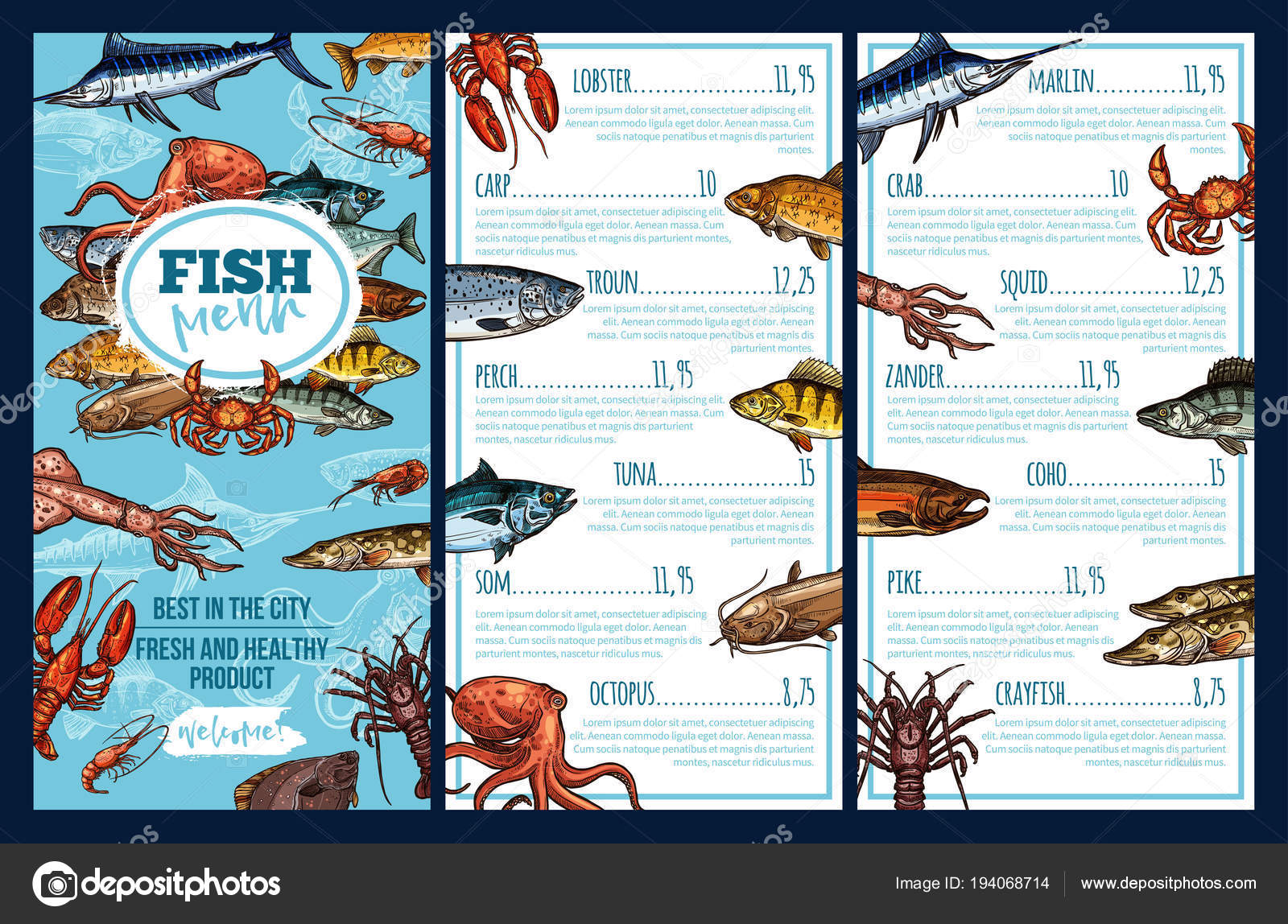 Seafood Restaurant Menu Template With Fish Sketch Stock Vector