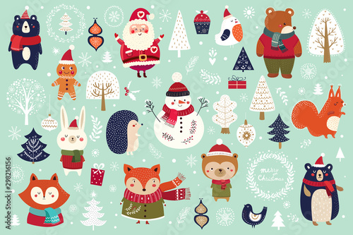Christmas Set With Santa Claus Happy Yeti Lovely Deer Tree